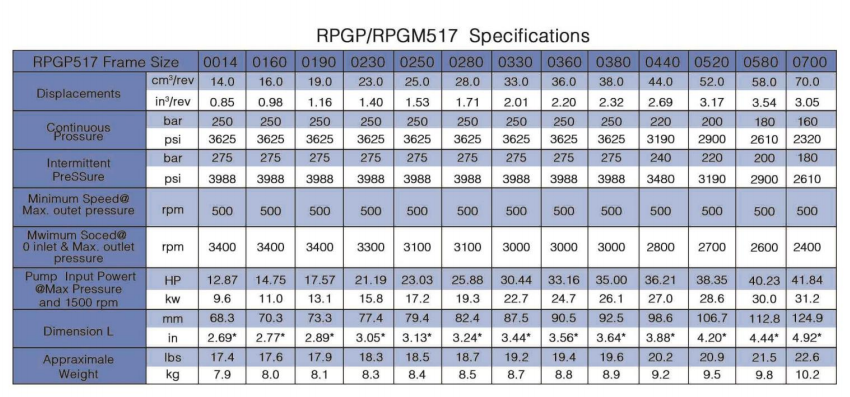 RCHC’s Aluminum Pump RPGP511 Series fixed displacement gear pump offers high performance and high power density due to its aluminum construction, making it an ideal selection for the Aerial, Agriculture, Construction, Forestry, Material Handling, and Turf Equipment markets where durability and efficiency are important.Features & Benefits: Three-piece construction for distribution flexibility, Aluminum pumping sections for light weight,Journal bushings for long life, Pressure balanced thrust blocks for high efficiency.Sizes from 4 to 33cc,Operating pressures up to 250 bar,Speeds up to 3,500 rpm,Rotation CW and CCW.